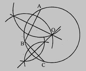 2. 作 $AB$ 和 $BC$ 的垂直平分線,它們相交於點 $O$。