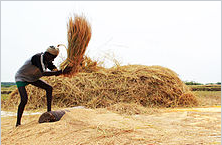 - 早些時候,脫粒過程是手工用連枷進行的。農場裡的婦女過去常常敲打曬乾的莖稈以將其與穀物分離。這是一個費力且漫長的過程。