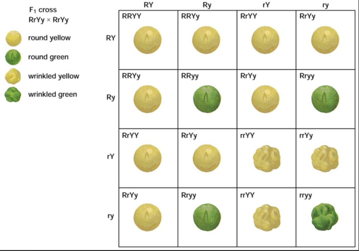 在F2代中,所有性狀都獨立遺傳。(圓形黃色、圓形綠色、皺縮黃色、皺縮綠色)。