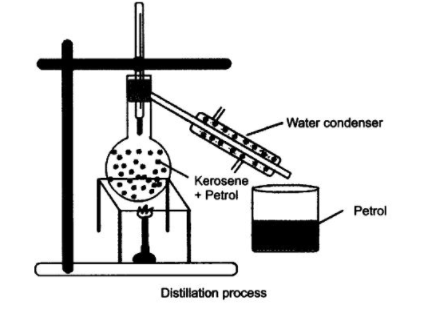 汽油首先汽化,因為它沸點較低。它在冷凝器中冷凝,並從冷凝器出口收集。