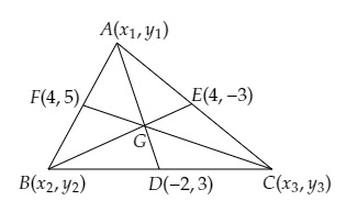 設$\triangle ABC$的頂點分別為$A (x_1, y_1)、B (x_2, y_2)$和$C (x_3, y_3)$,且$D(-2,3)、E(4,-3)$和$F(4,5)$分別是$BC、CA$和$AB$的中點。