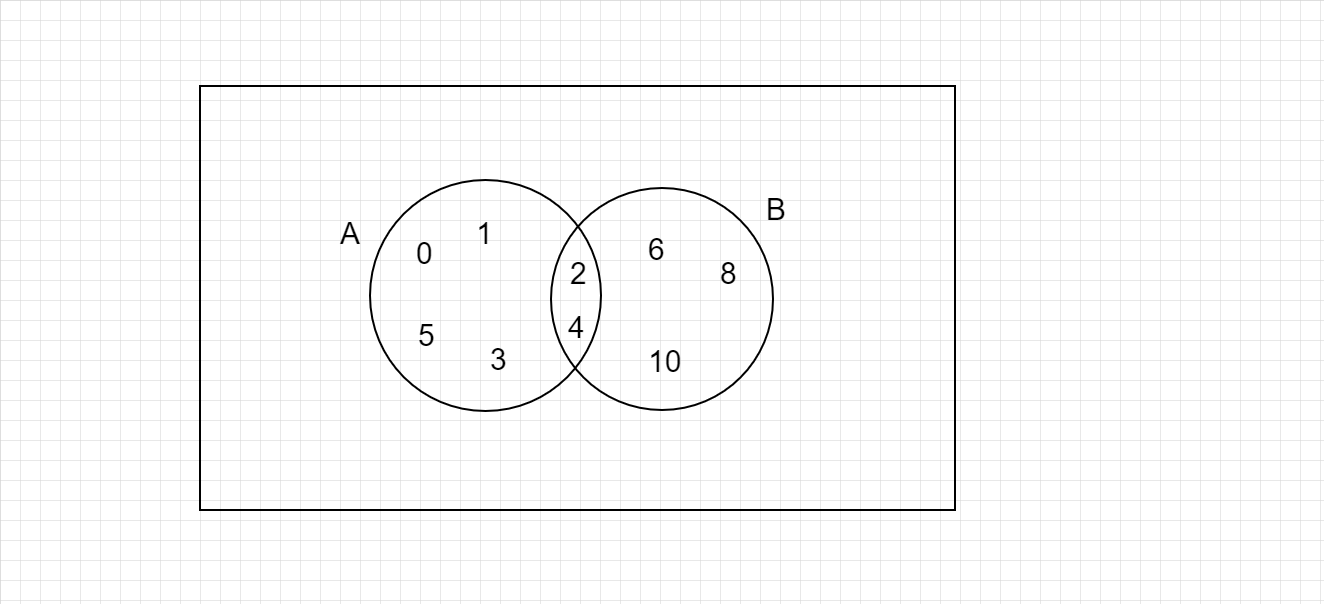 A = {0, 1, 2, 3, 4, 5}; B = {2, 4, 6, 8, 10}