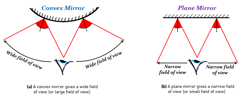 凸面鏡視野更廣,並且總是形成許多物體的虛像、正立、縮小的影像。