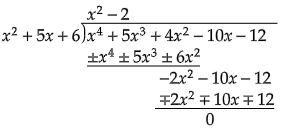 $\because ( x+2)$ 和 $( x+3)$ 是多項式 $x^4+5x^3+4x^2-10x-12$ 的因式。那麼,用 $g( x)=x^2+5x+6$ 除多項式 $x^4+5x^3+4x^2-10x-12$。