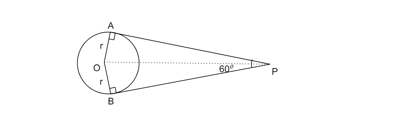 如果從圓外一點 $P$ 引出的兩條切線與半徑為 $r$、圓心為 $O$ 的圓所成的角為 $60^o$,則求 $OP$ 的長度。