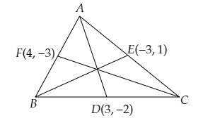 設$\triangle ABC$的頂點為$A (x_1, y_1), B (x_2, y_2)$和$C (x_3, y_3)$,$D(3,-2), E(-3,1)$和$F(4,-3)$分別是$BC, CA$和$AB$的中點。