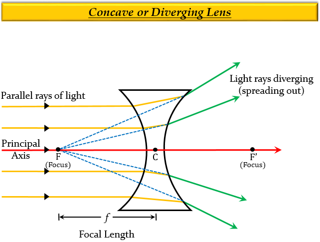 發散透鏡或凹透鏡$-$ 它是一種至少有一個表面向中間內彎的透鏡。換句話說,它在中間較薄,在上邊緣和下邊緣較厚,因此進入透鏡的光線會散開或發散,從而形成較小的影像。由於這種效應,它也稱為負透鏡或發散透鏡。
