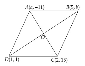 點 $A (a, -11), B (5, b), C (2, 15)$ 和 $D (1, 1)$ 是平行四邊形 $ABCD$ 的頂點。