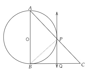 在直角三角形ABC中,∠B=90°,以AB為直徑作圓,該圓與斜邊AC相交於點P。