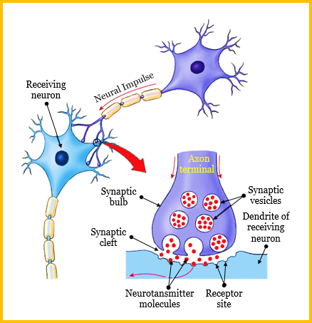 在突觸中,化學訊號從一個神經元的軸突末梢傳遞到相鄰神經元的樹突末梢。