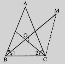 在$\triangle ABC$中,已知$AB = AC$,且$\angle B$和$\angle C$的角平分線交於點$O$。如果$M$是$BO$延長線上的一個點,證明$\angle MOC = \angle ABC$。