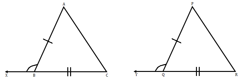 在△ABC和△PQR中,AB = PQ,BC = QR,CB和RQ分別延長到X和Y,且∠ABX = ∠PQY。證明△ABC ≅ △PQR。