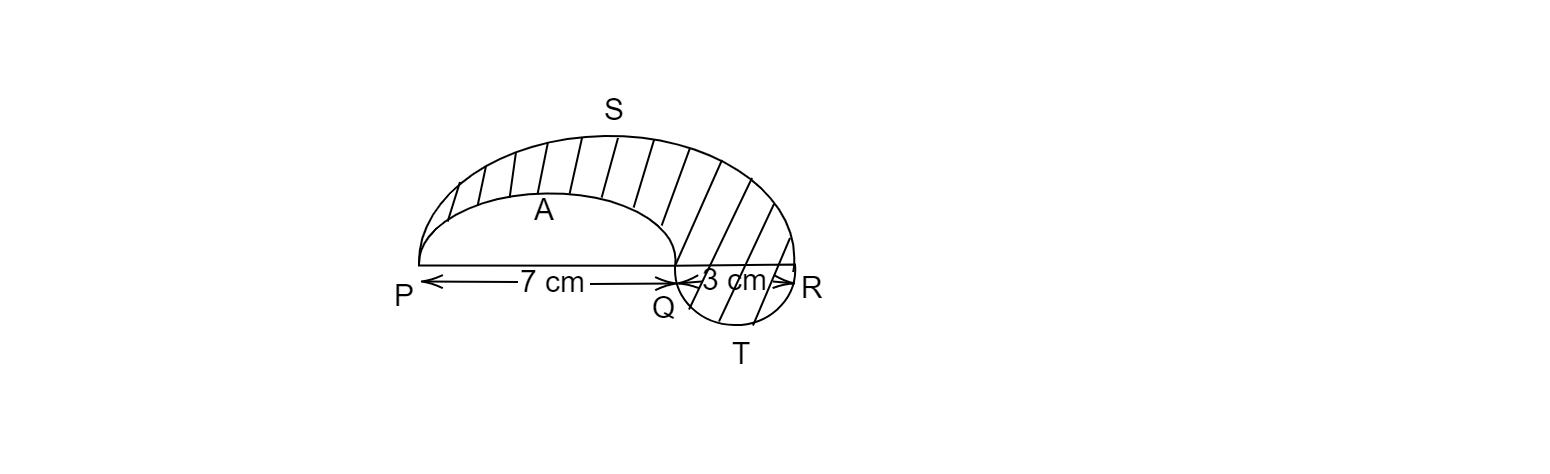 圖5中,PSR、RTQ和PAQ分別是直徑為10釐米、3釐米和7釐米的三個半圓。求陰影區域的周長。[使用π = 3.14]