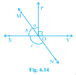 如圖 6.14 所示,直線\( \mathrm{XY} \) 和 \( \mathrm{MN} \) 相交於 \( O \)。如果 \( \angle \mathrm{POY}=90^{\circ} \) 且 \( a: b=2: 3 \),求 \( c \)。