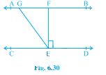 如圖 6.30 所示,如果 \( \mathrm{AB} \| \mathrm{CD} \),EF \( \perp \mathrm{CD} \) 且 \( \angle \mathrm{GED}=126^{\circ} \),求 \( \angle \mathrm{AGE} \)、\( \angle \mathrm{GEF} \) 和 \( \angle \mathrm{FGE} \)。