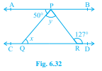 如圖 6.32 所示,如果 AB ∥ CD,∠APQ = 50° 且∠PRD = 127°,求 x 和 y 的值。
