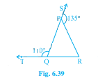 如圖 6.39 所示,△PQR 的邊 QP 和 RQ 分別延長到點 S 和 T。如果∠SPR = 135° 且∠PQT = 110°,求∠PRQ。