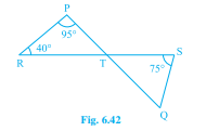 如圖 6.42 所示,如果直線\( \mathrm{PQ} \)和\( \mathrm{RS} \)相交於點\( \mathrm{T} \),使得\( \angle \mathrm{PRT}=40^{\circ}, \angle \mathrm{RPT}=95^{\circ} \)且\( \angle \mathrm{TSQ}=75^{\circ} \),求\( \angle \mathrm{SQT} \)。