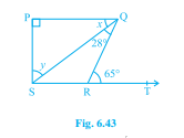 如圖 6.43 所示,如果\( \mathrm{PQ} \perp \mathrm{PS}, \mathrm{PQ} \| \mathrm{SR}, \angle \mathrm{SQR}=28^{\circ} \) 且 \( \angle \mathrm{QRT}=65^{\circ} \),則求 \( x \) 和 \( y \) 的值。