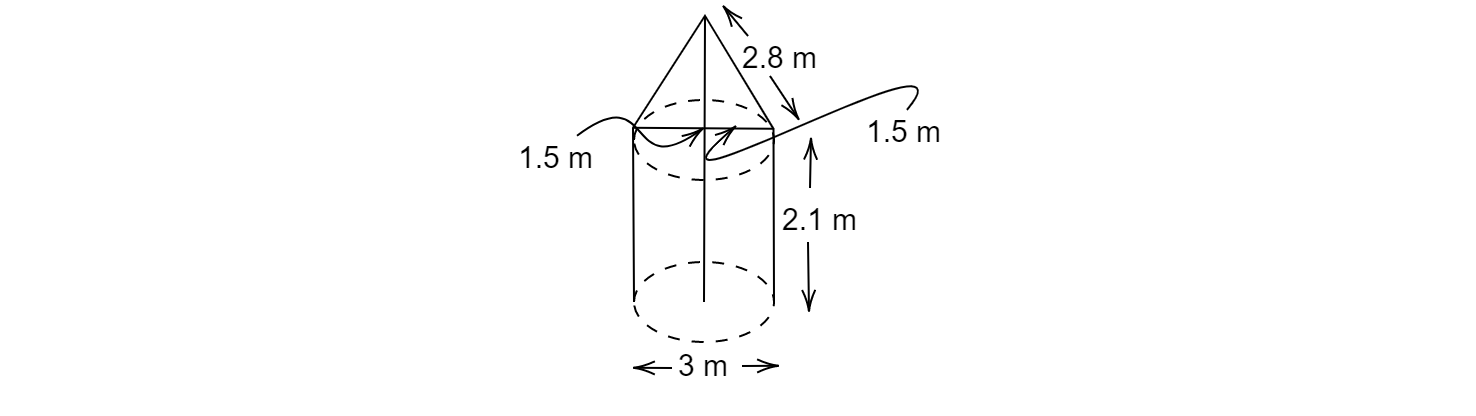 已知:一個帳篷呈圓柱體形,頂部為圓錐形,且圓柱體和圓錐體的直徑相同。如果圓柱體部分的高度和直徑分別為 $2.1\ m$ 和 $3\ m$,圓錐體部分的斜高為 $2.8\ m$。