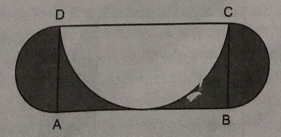在下圖中,ABCD是一個矩形,其中AB=14釐米,BC=7釐米。以DC、BC和AD為直徑,繪製三個半圓,如圖所示。求陰影區域的面積。
