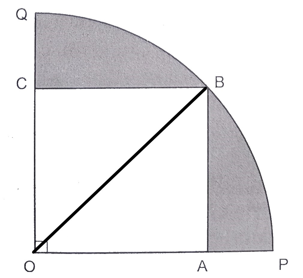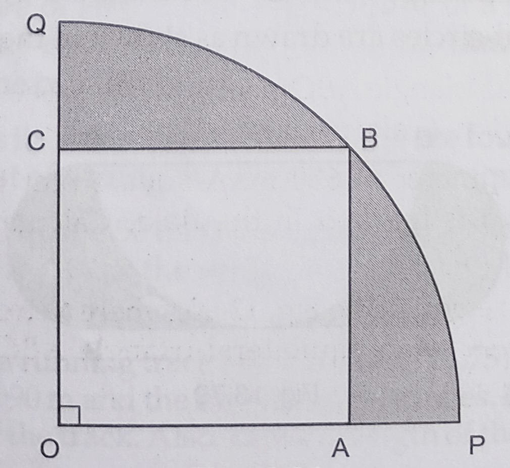 在下圖中,正方形\( O A B C \)內接於圓的象限\( O P B Q \)。如果\( O A=21 \mathrm{~cm} \),求陰影區域的面積。