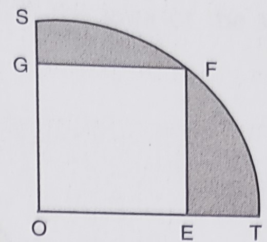 在下圖中,\( OE=20 \mathrm{~cm} \)。扇形 OSFT 內接正方形 OEFG。求陰影部分的面積。