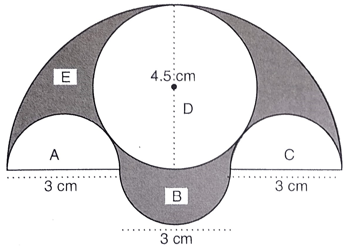 在下圖中,有三個半圓A、B和C,每個直徑為3釐米,還有一個半圓E,其中包含一個直徑為4.5釐米的圓D。計算陰影區域的面積。