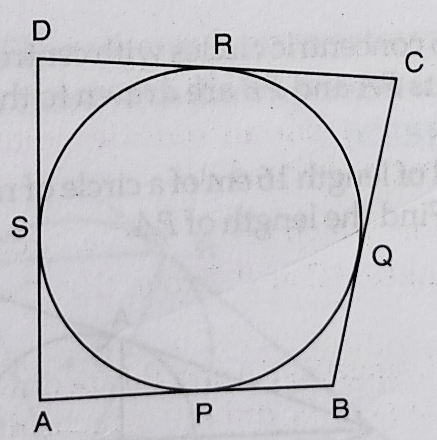 如圖所示,一個圓與四邊形ABCD的四條邊相切,已知AB=6cm,BC=7cm,CD=4cm。求AD。