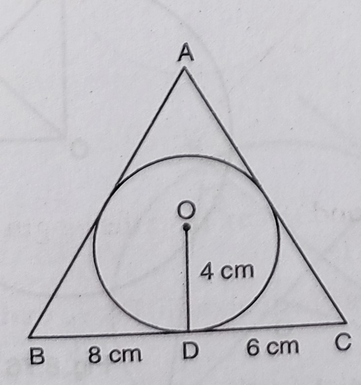 如圖所示,一個三角形 ABC 外接一個半徑為 4 釐米的圓,線段 BD 和 DC 的長度分別為 8 釐米和 6 釐米。