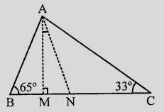 如圖所示,$AM \perp BC$,$AN$ 是 $\angle A$ 的角平分線。如果 $\angle B = 65^o$ 和 $\angle C = 33^o$,求 $\angle MAN$。