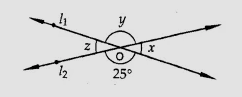 因此,x = 155°,y = 25°,z = 155°。
