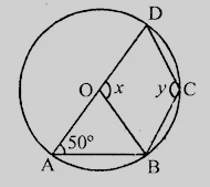 如圖所示,O是圓心,∠DAB = 50°。計算x和y的值。