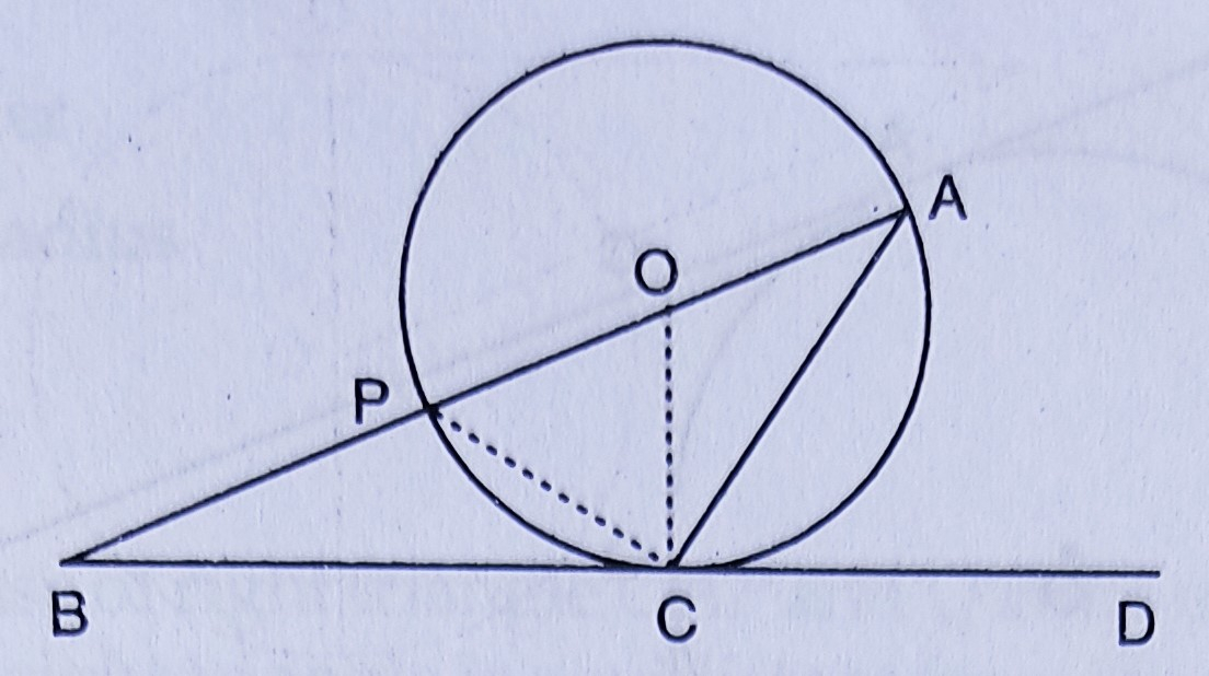 如圖所示,\( O \)是圓心,\( BCD \)在\( C \)點與圓相切。證明\( \angle BAC+\angle ACD=90^{\circ} \)。