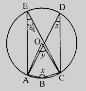 如圖所示,$O$是圓心。如果$\angle CEA = 30^o$,求$x$、$y$和$z$的值。
