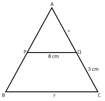 如圖所示,P 是 AB 的中點,PQ ∥ BC。求 x 和 y 的值。