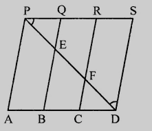 如圖所示,$PSDA$是一個平行四邊形,其中$PQ = QR = RS$,且$AP \parallel BQ \parallel CR$。證明$ar(\triangle PQE) = ar(\triangle CFD)$。