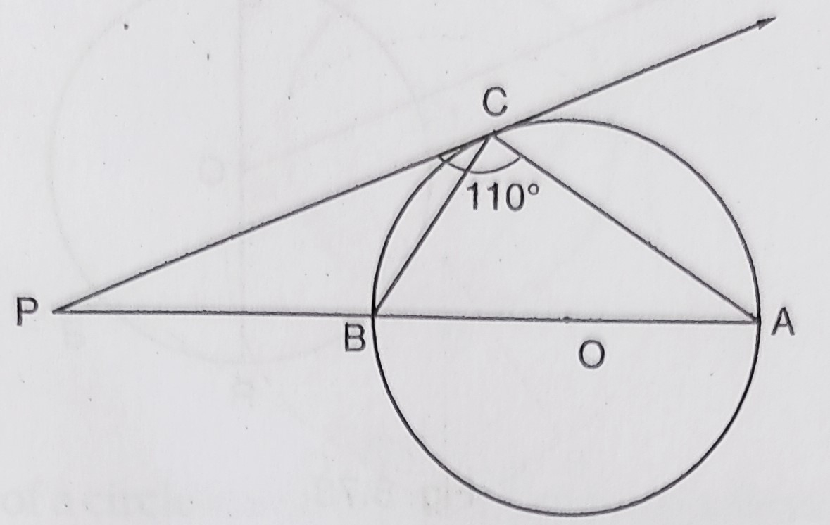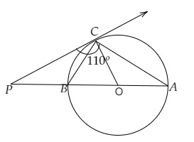 如圖所示,圓的一點 \( C \) 的切線與延長後的直徑 \( AB \) 相交於點 \( P \)。如果 \( \angle PCA = 110^{\circ} \),求 \( \angle CBA \)。