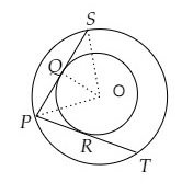 如圖所示,有兩個同心圓,圓心為 O。\( P R T \) 和 \( P Q S \) 是從外圓上一點 \( P \) 引到內圓的切線。