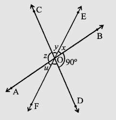 如圖所示,三條共面直線相交於點$O$,形成如圖所示的角。求$x, y, z$和$u$的值。