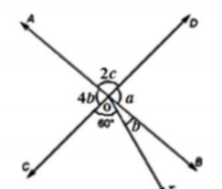 如圖所示,兩條直線\( \mathrm{AB} \& \mathrm{CD} \)相交於\( \mathrm{O} \)。如果\( \angle \mathrm{COT}=60^{\circ} \),求\( \mathrm{a}, \mathrm{b}, \mathrm{c} \)。