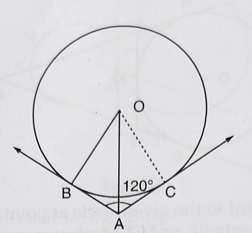 如圖所示,在圓心為 \( O \) 的圓上作兩條切線 \( A B \) 和 \( A C \),使得 \( \angle B A C=120^{\circ} \)。
