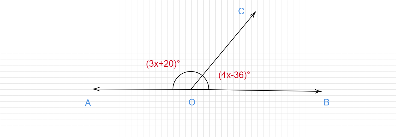 $\angle AOC = 3x+20, \angle BOC = 4x-36$。