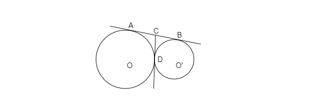 已知:在給定的圖形中,兩個圓在點$D$處相切。一條公切線分別與兩個圓相切於$A$和$B$。