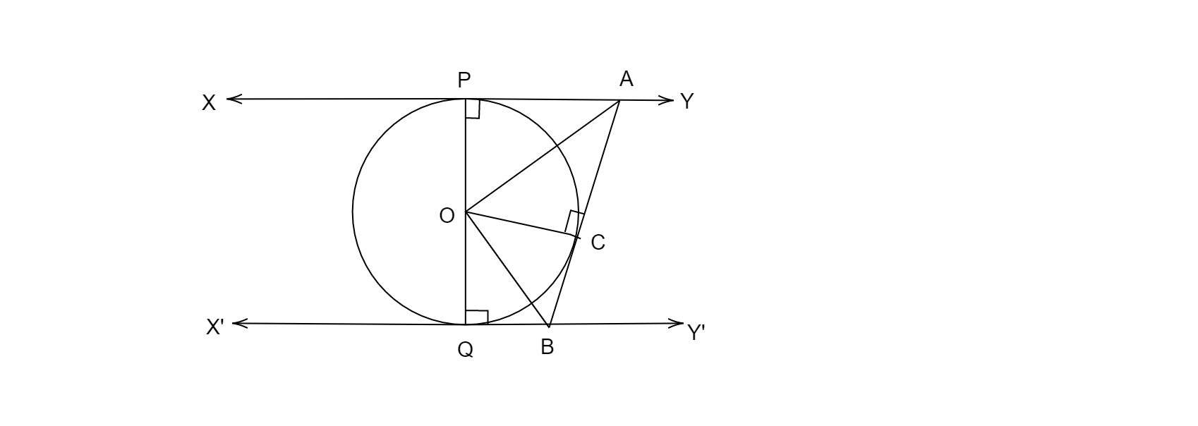 XY 和 X'Y' 是圓心為 O 的圓的兩條平行切線,分別與圓相切於 P 和 Q。