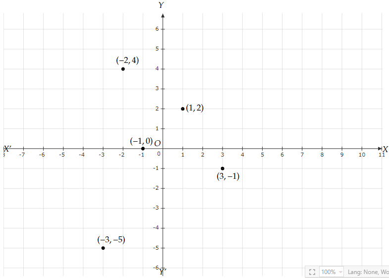 點\( (-2,4),(3,-1),(-1,0) \), \( (1,2) \) 和 \( (-3,-5) \) 分別位於哪個象限或哪條座標軸上?透過在笛卡爾平面中定位這些點來驗證你的答案。