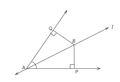 直線\( l \)是角\( A \)的角平分線,\( B \)是\( l \)上的任意一點。BP 和 BQ 是從 B 到角\( \angle A \)的兩邊的垂線。