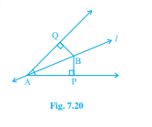 直線 \( l \) 是角 \( \angle A \) 的角平分線,\( B \) 是 \( l \) 上任意一點。BP 和 BQ 分別是 B 到 \( \angle A \) 兩邊的垂線。證明