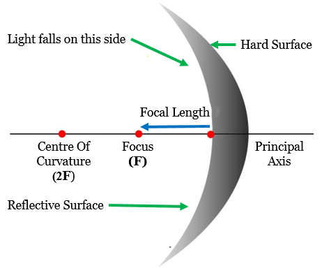 凹面鏡中間向內彎曲的鏡面。由於當平行入射光線照射到鏡面上時,光線會反射並匯聚到特定一點並形成,因此它也被稱為 會聚鏡