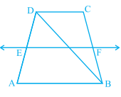 已知梯形\( \mathrm{ABCD} \)中,\( \mathrm{AB} \| \mathrm{DC} \),\( \mathrm{BD} \)為對角線,\( \mathrm{E} \)為\( \mathrm{AD} \)的中點。過E作一條平行於\( \mathrm{AB} \)的直線,交\( \mathrm{BC} \)於\( \mathrm{F} \)(見下圖)。求證:\( \mathrm{F} \)是\( \mathrm{BC} \)的中點。